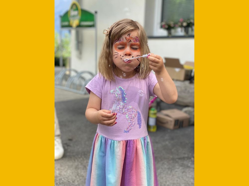 Ein besonderer Programmpunkt war die Einladung an die Besucher, einen Sonnenstrahl zu beschriften – ein Symbol für Wünsche und Hoffnung für die Familien, die von Krankheit betroffen sind. Außerdem wurden Seifenblasen verteilt, was bei den kleinen Gästen für Freude sorgte. Kinderschminken wurde angeboten, um den Tag noch bunter zu gestalten.