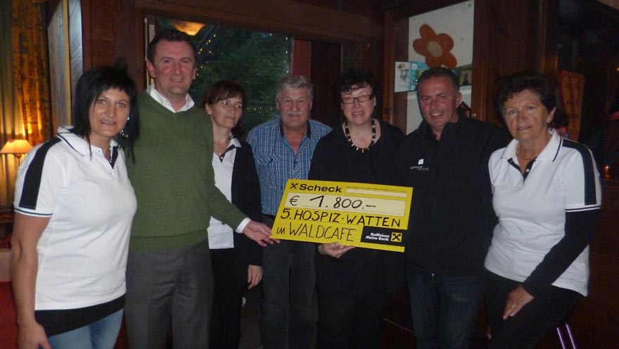 Am 17. April 2014 veranstalteten Friedl und Martin Fankhauser vom Gasthaus Waldcafe in Mayrhofen das 5. HOSPIZWATTEN.Der Erlös sowie die großzügige Spende der Klöpflsinger, kommt in diesem Jahr dem Neubau des Hospizhauses in Innsbruck zu Gute. Vorstandsmitglied der Tiroler Hospiz-Gemeinschaft Frau Birgit Drewes sowie einige ehrenamtliche Mitarbeiter der Hospizgruppe Zillertal übernahmen den Scheck in der Höhe von 1.800 €.