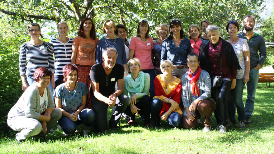 Vergangenes Wochenende haben 16 Frauen und zwei Männer die Ausbildung zu ehrenamtlichen HospizbegleiterInnen begonnen. Am Foto sind alle TeilnehmerInnen mit Kursbegleiterin Renate Fuchs (2. Reihe 1.v.li.) von der Tiroler Hospiz-Gemeinschaft.