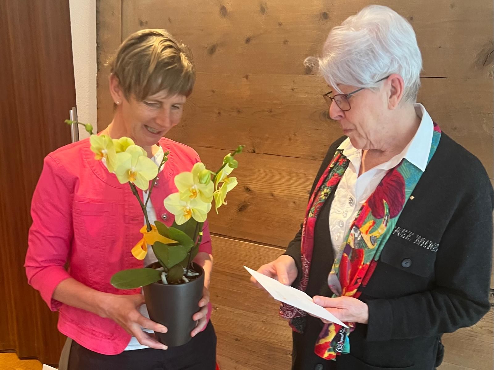 Für über 10 Jahre wurden Herta File, Renate Kaufmann, Elisabeth Bazzanella und Juen Gaby geehrt. Die Stärke und Beständigkeit eines Teams liegt aber darin, dass sich alle gleichermaßen engagieren und unterschiedliche Funktionen und Aufgaben übernehmen. Eine besonders wichtige Funktion ist dabei, für die Finanzen zuständig zu sein und umsichtig mit den Spendengeldern umzugehen. Rita Thaler übernahm seit Gründung des Hospizteams diese Aufgabe, verdankte jede Spende und verwaltete die Spenden für Fort-und Weiterbildungen, Supervisionen sowie Team Tage. Als Dank an Rita überreichten wir ihr eine gelbe Orchidee. Nach über 20 Jahren in dieser Funktion, übergab Rita Thaler ihre Aufgabe nun an Ingrid Bürger.