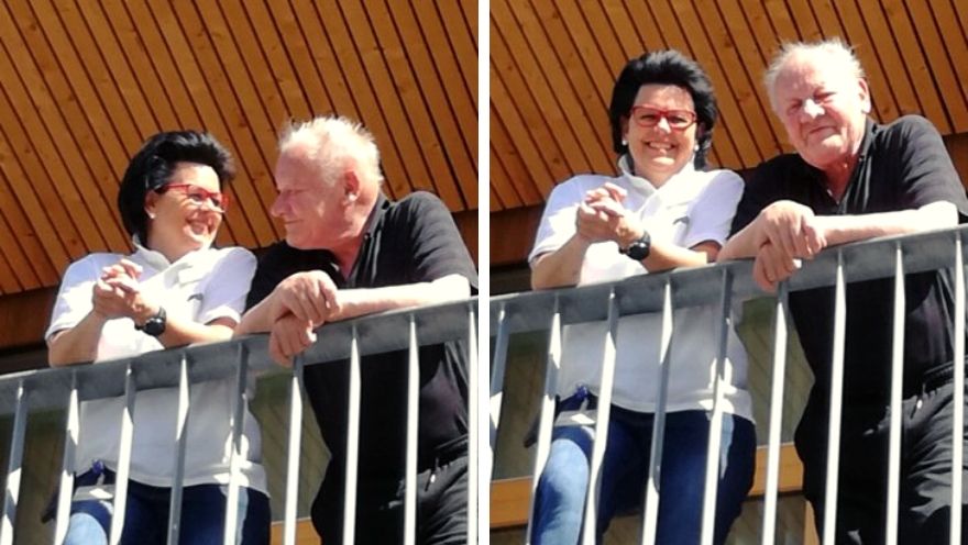Unsere Krankenschwester Karin Pirkl genießt gemeinsam mit einem Patienten die morgendliche Sonne auf dem großen Balkon der Hospiz- und Palliativstation im 1. Stock.