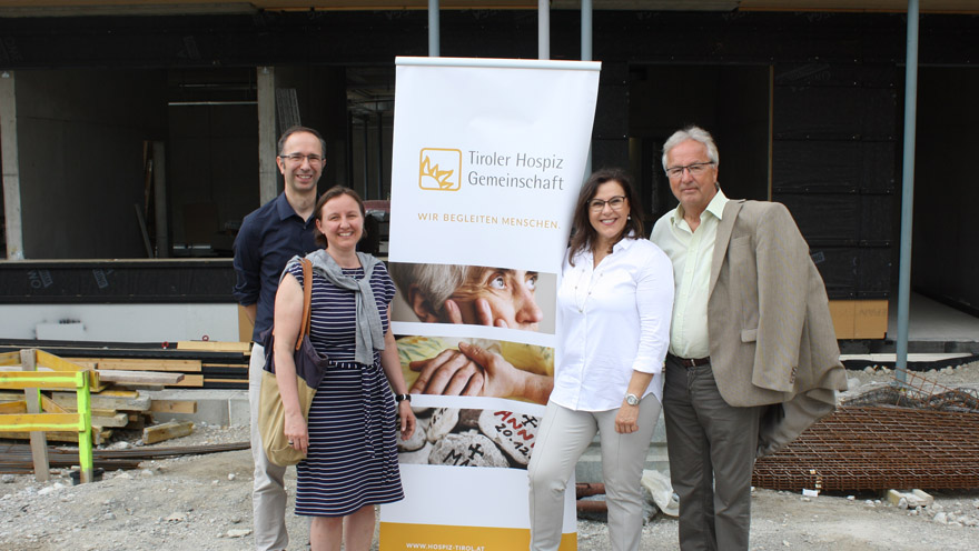 Die Architekten Paul Wichert und Sybille Caspar freuen sich mit Elisabeth Zanon und Peter Hanser (beide Tiroler Hospiz-Gemeinschaft) über die gelungene Firstfeier auf der Hospizhaus-Baustelle, die am 12. Juni 2017 stattfand.