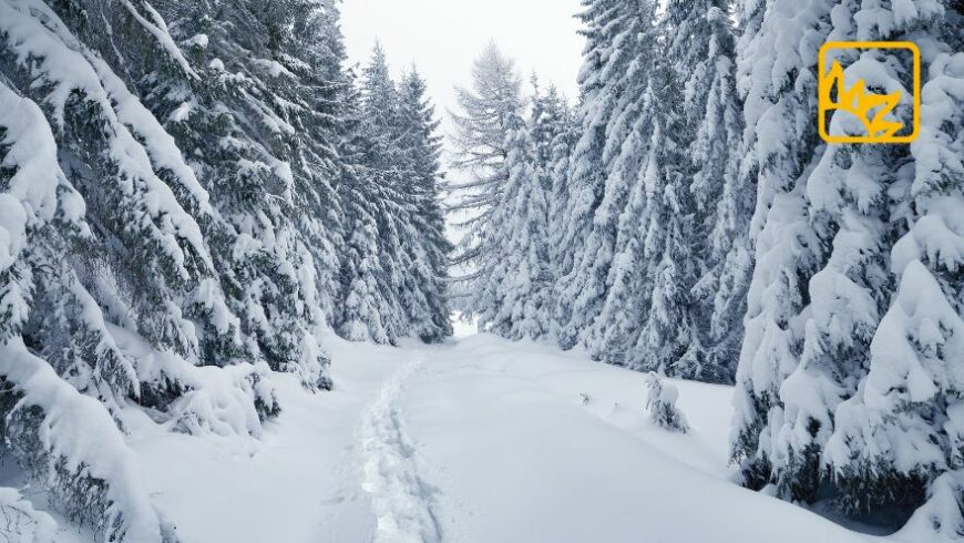 Bild eines Waldes im Winter mit Spruch