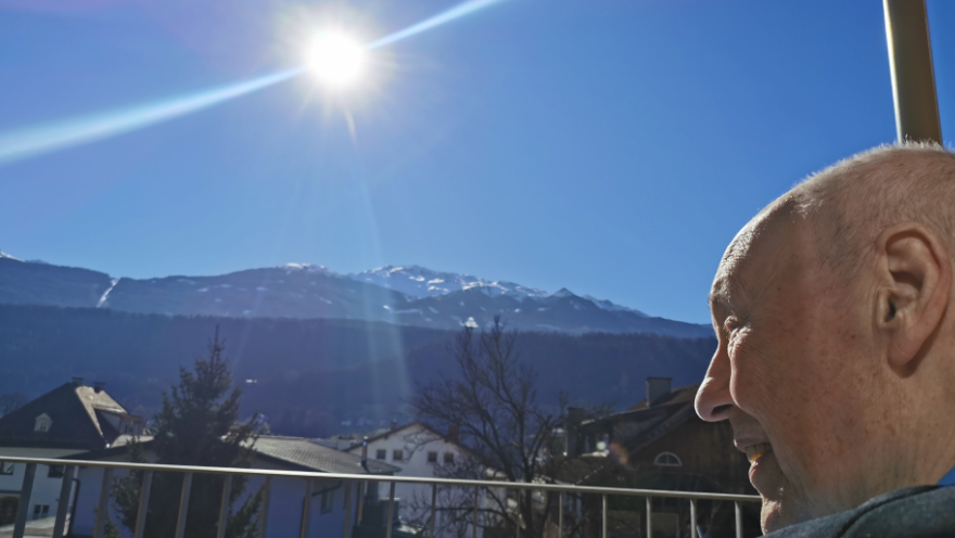 Unser Patient Herr Adi genießt die Frühlingssonne am Balkon des Hospizhauses in vollen Zügen.