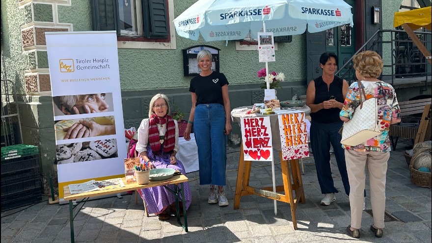 Die ehrenamtlichen Hospizbegleiterinnen des Hospizteams Kitzbühel beteiligten sich am Tag der Herzlichkeit, dem 16.06.2023 am Wochenmarkt in St. Johann/Tirol.