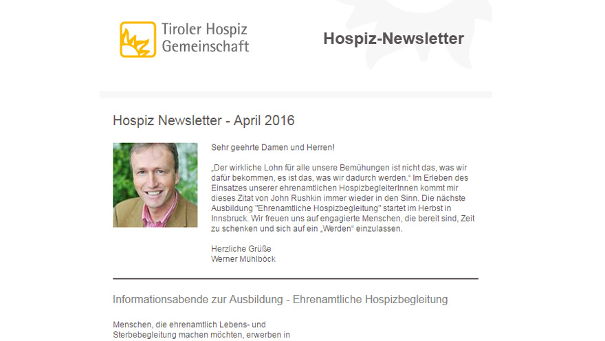 Der Newsletter der Tiroler Hospiz-Gemeinschaft informiert Sie ca. 4x jährlich über aktuelle Themen der Hospizbewegung in Tirol.