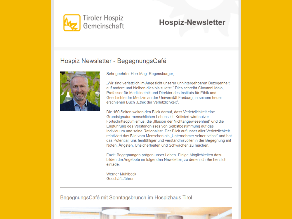 Der Newsletter der Tiroler Hospiz-Gemeinschaft informiert Sie regelmäßig über aktuelle Themen der Hospizbewegung in Tirol.