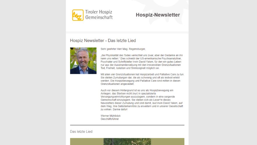 Der Newsletter der Tiroler Hospiz-Gemeinschaft informiert Sie regelmäßig über aktuelle Themen der Hospizbewegung in Tirol.