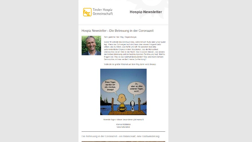 Der Newsletter der Tiroler Hospiz-Gemeinschaft informiert Sie regelmäßig über aktuelle Themen der Hospizbewegung in Tirol.