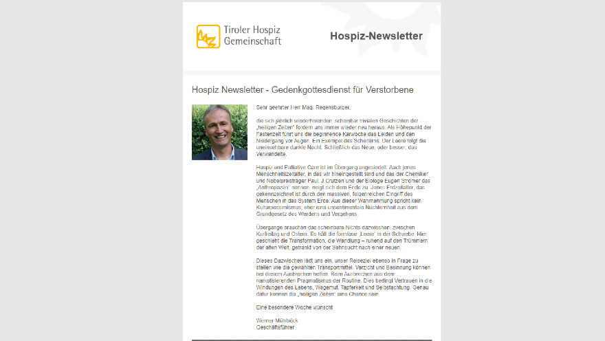 Der Newsletter der Tiroler Hospiz-Gemeinschaft informiert Sie regelmäßig über aktuelle Themen der Hospizbewegung in Tirol.