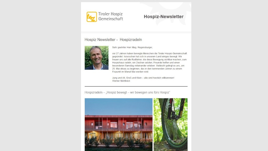 Der Newsletter der Tiroler Hospiz-Gemeinschaft informiert Sie regelmäßig über aktuelle Themen der Hospizbewegung in Tirol.