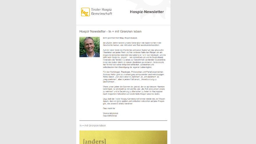 Der Newsletter der Tiroler Hospiz-Gemeinschaft informiert Sie regelmäßig über aktuelle Themen der Hospizbewegung in Tirol.