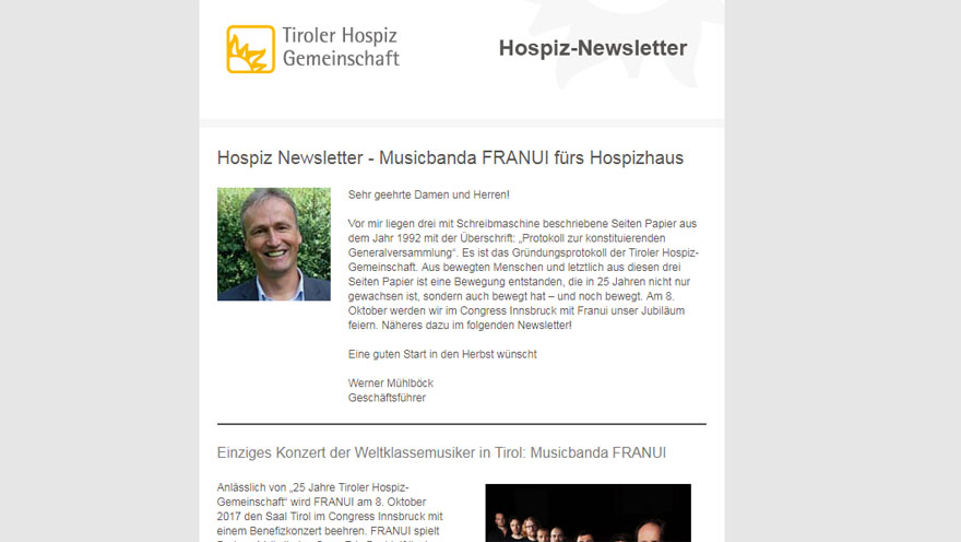 Der Newsletter der Tiroler Hospiz-Gemeinschaft informiert Sie regelmäßig über aktuelle Themen der Hospizbewegung in Tirol.