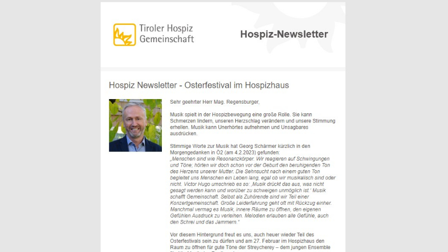 Der Newsletter der Tiroler Hospiz-Gemeinschaft informiert Sie regelmäßig über aktuelle Themen der Hospizbewegung in Tirol.