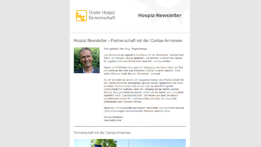 Der Newsletter der Tiroler Hospiz-Gemeinschaft informiert Sie regelmäßig über aktuelle Themen der Hospizbewegung in Tirol.