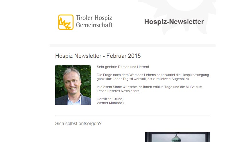 Der Newsletter der Tiroler Hospiz-Gemeinschaft informiert Sie ca. 4x jährlich über aktuelle Themen der Hospizbewegung in Tirol.