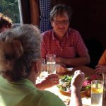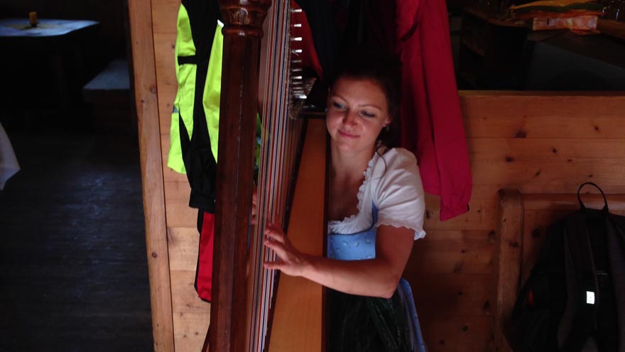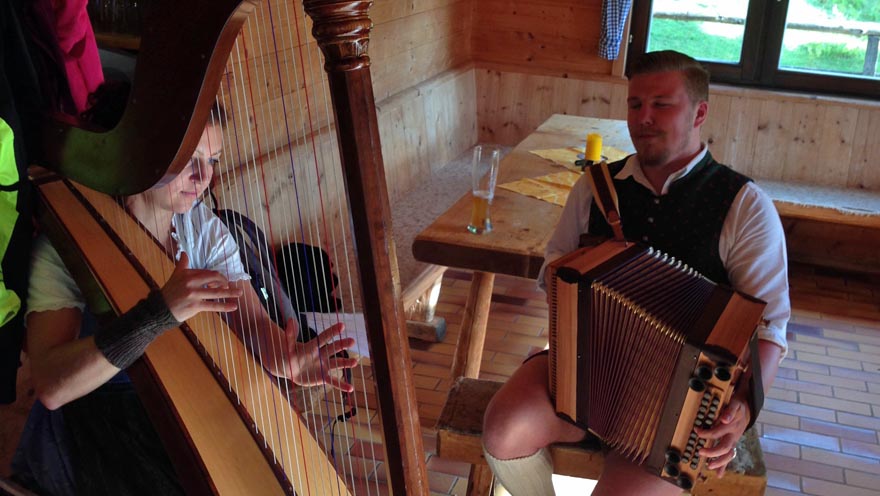 Die Sennerin Gisela hat für uns einen Wildkräuter-Salat, eine Wildkräuter-Suppe und Kasspatzeln vorbereitet. Anschließend gab es noch Kaffee und selbstgebackenen Kuchen. Die Musikanten Maria und Michael unterhielten uns mit Volksmusik. Es war für uns alle ein sehr netter und unterhaltsamer Nachmittag.