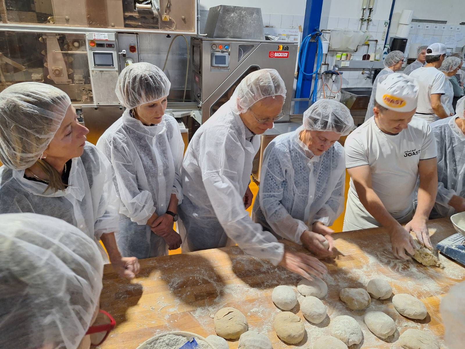 Im Anschluss an die allgemeine Einführung wird unser Team geteilt und abwechselnd geht es in die Praxis des Gebäckformens mit vorbereiteten Teiglingen unter der Leitung des erfahrenen Bäckers Edi Blaßnig und zur Führung durch den Betrieb, die Ernst Joast selbst macht und bereitwillig auf alle Fragen antwortet.