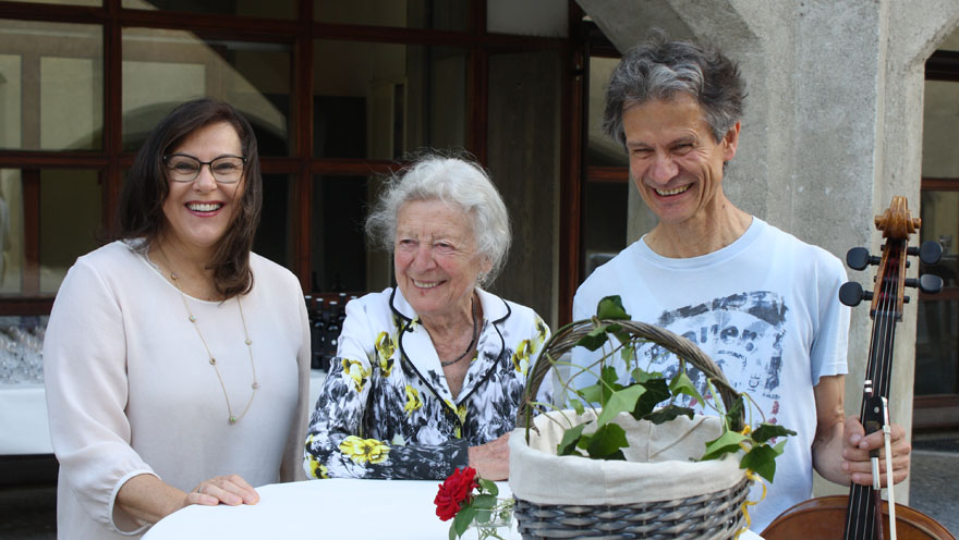 Elisabeth Zanon (Tiroler Hospiz-Gemeinschaft), Julia Gschnitzer und Nikolaus Meßner (Cellist) freuen sich über den erfolgreichen Abend fürs Hospizhaus Tirol.