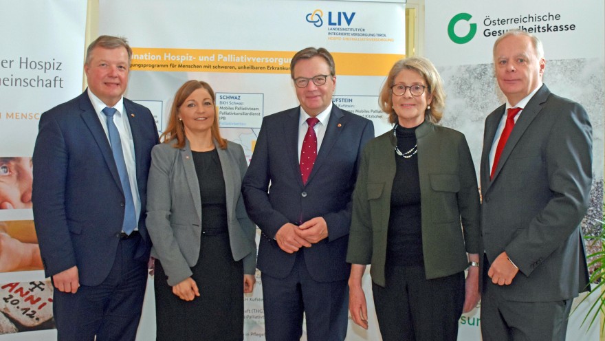 Die landesweite Hospiz- und Palliativversorgung, die nun in allen Tiroler Bezirken zur Verfügung steht, präsentierten von links Pflegelandesrat Bernhard Tilg, Ulrike van Appeldorn, Projektleitung Hospiz- und Palliativversorgung Tirol, LH Günther Platter, Marina Baldauf, Tiroler Hospiz-Gemeinschaft, sowie Werner Salzburger, Co-Vorsitzender der Landeszielsteuerungskommmission des Tiroler Geundheitsfonds.