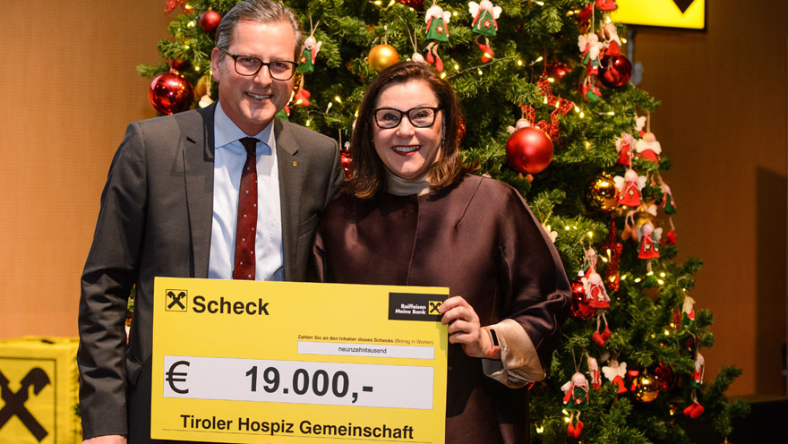 Beeindruckt von der Stimmung bei der Adventfeier der Raiffeisen-Landesbank Tirol AG und dem hohen Spendenbetrag, den die Mitarbeiter gestiftet haben, zeigte sich die Vorsitzende der Tiroler Hospiz-Gemeinschaft, Dr. Elisabeth Zanon. Sie nahm den Scheck in Höhe von 19.000 Euro von Dr. Johannes Ortner entgegen. Der von den Mitarbeitern gespendete Betrag wurde auch heuer wieder von der RLB Tirol AG verdoppelt. Eine Summe in dieser Höhe habe es bis jetzt noch nie gegeben, erläutert Johannes Ortner. Es zeige, dass das Thema für viele Mitarbeiterinnen und Mitarbeiter von großer Bedeutung sei. Zusätzlich zum finanziellen Beitrag hingen am Christbaum der heurigen Adventfeier Hunderte Engel, die ebenfalls an Patienten der Hospiz-Gemeinschaft verschenkt werden. „Es ist ein Zeichen für die Menschen, dass sie auf ihrem Weg nicht alleine sind“, so Ortner.