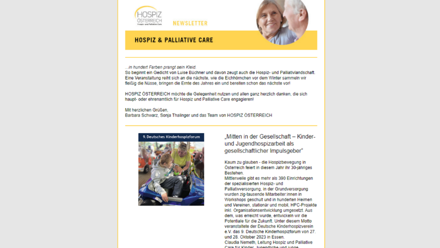 Der aktuelle Newsletter des Dachverbandes Hospiz Österreich gibt einen aktuellen Überblick über die Entwicklung der Hospizarbeit in Österreich.