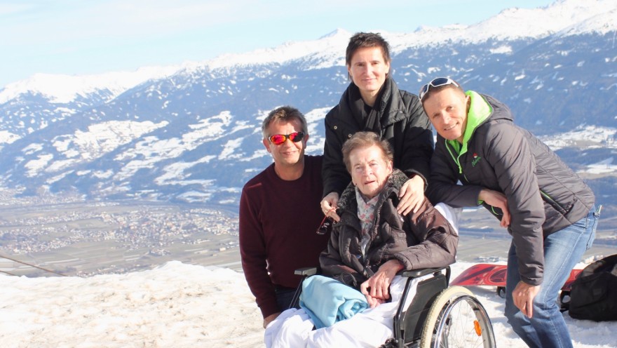 „Dass ich jetzt, obwohl ich so krank bin, zum ersten Mal gemeinsam mit meinen Kindern und meinem Schwiegersohn auf die Seegrube komme, hätte ich nie gedacht“, erzählte die 80-jährige Rosemarie Schwemberger. „Vor einigen Tagen haben mich Christian (Seelsorger im Hospizhaus Tirol) und Birgit (Diplomkrankenpflegerin auf der Palliativstation) gefragt, ob ich noch einen Wunsch hätte. Und da war ich so frei und hab halt gesagt, dass es schon schön wäre, mit meiner Familie auf die Seegrube zu fahren und hinunter nach Innsbruck zu schauen.“