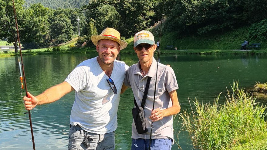 Am Vormittag brachen sie zum Fischteich beim Stamser Stift auf. „Die zwei jungen Männer, die die Teiche bewirtschaften, sind sehr engagiert,“ berichtet Johannes: „In einigen Teichen züchten sie die Fische und zwei größere Teiche sind für die Öffentlichkeit zugänglich.“ Nach der Ankunft wurde gleich fleißig gefischt und Johannes war ganz in seinem Element. Nach einer längeren Pause ging es nachmittags in die zweite Runde. „Markus und ich sind dann ein wenig ehrgeizig geworden und haben einen kleinen Wettbewerb gestartet, wer mehr Fische fängt,“ blickt Johannes auf den schönen Tag zurück: „Die Idee von Markus, dass wir einen Rollstuhl mitgenommen haben, war im Nachhinein doch sehr gut. Ich dachte vorher ich brauche ihn nicht, aber er war wirklich sehr hilfreich.“ Insgesamt holten sie mehr als 20 Fische aus dem Teich.