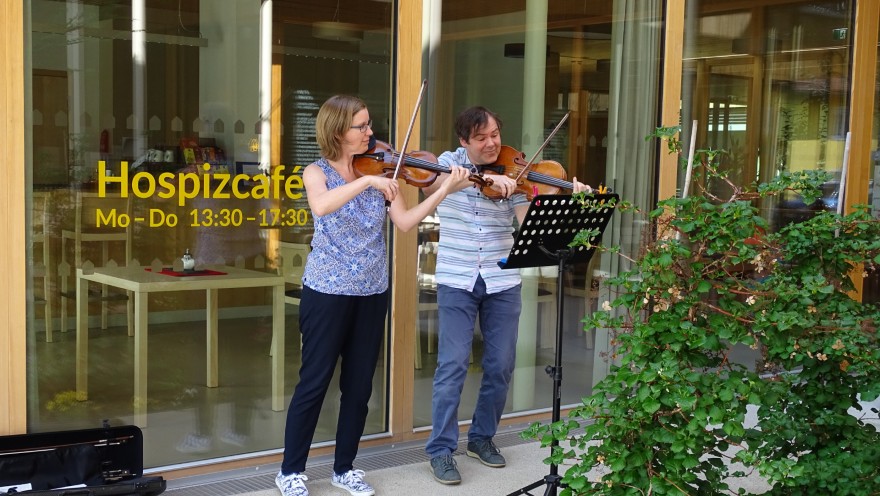 Ein weiterer Höhepunkt war ein kleines „Osterkonzert“ am Ostersonntag um 15:00 Uhr. Die Profimusiker Michaela Huber-Achatz und Markus Huber, aus unserer Haller Nachbarschaft, zauberten mit Ihren Geigen ein Lächeln in die Gesichter von Patient*innen, Angehörigen und Mitarbeiter*innen, die der Darbietung vom Balkon aus lauschten. „Musik spielt den Staub von der Seele“ und – das sei hier ergänzt – erfrischt gerade in diesen Tagen der Isolation und „berührt“.