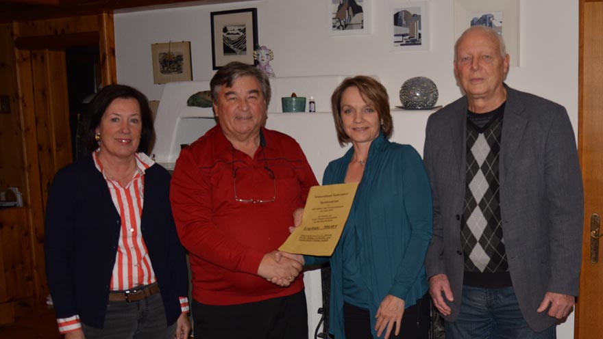Im Bild: v. li. nach re: Judit Bretterklieber (Hospizgruppe Kufstein), Obmann Otto Hauser übergibt die Spende an Zangerl Sabine (Tiroler Hospiz-Gemeinschaft), Kassier Heinz Kraißer