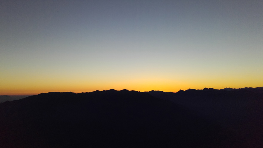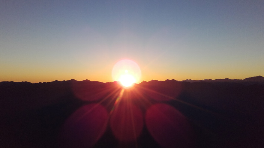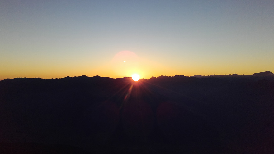 Zunächst Dunkelheit, dann das Erwachen, die Dämmerung, phantastische Farbspiele, der eindrucksvolle Sonnenaufgang, faszinierende Bergkulisse, nette Menschen, Freude über die Schönheit der Natur, schließlich tiefe Zufriedenheit und Müdigkeit…