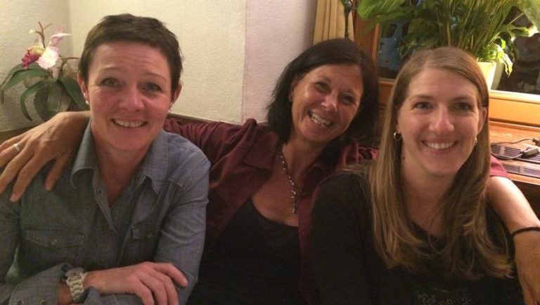Zwei Frauen, eine sitzt im Rollstuhl