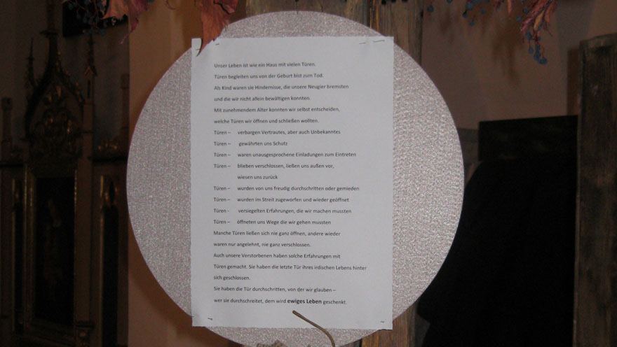 Auch unsere Verstorbenen haben solche Erfahrungen mit Türen gemacht. Sie haben die letzte Tür ihres irdischen Lebens hinter sich geschlossen. Sie haben die Tür durchschritten, von der wir glauben – wer sie durchschreitet, dem wird ewiges Leben geschenkt.
