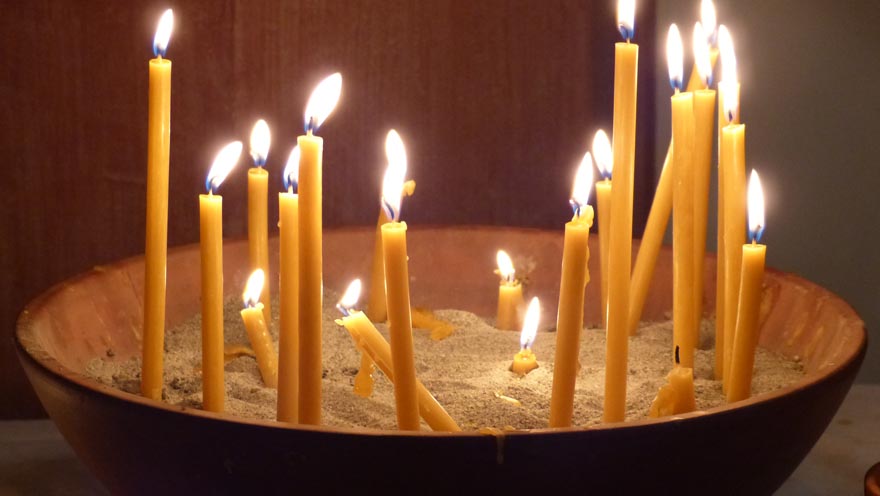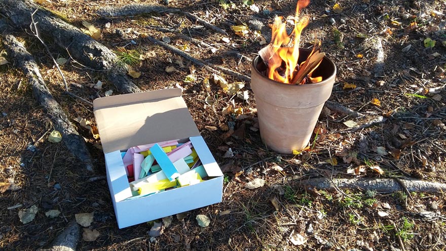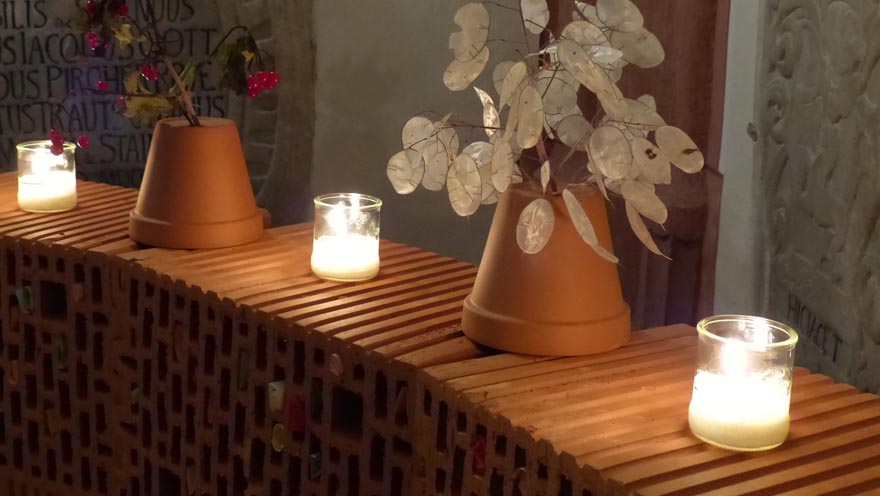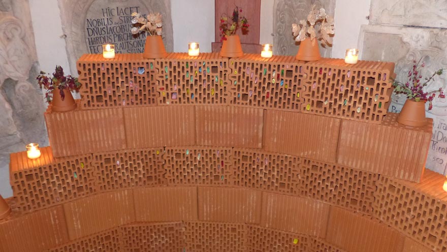 Ebenfalls mit einem Ritual verbunden, verbrannten wir am Nachmittag des Allerseelentages, was in den Ritzen der Klagemauer steckte, sowie die Versöhnungsbänder und übergaben die Steine, das „Schwere“ dem Kraftsee bei St. Michael. Das verband uns miteinander und mit allen, die den TrauerRaum aufgesucht hatten. Ein guter Abschluss für eine gelungene Veranstaltung.