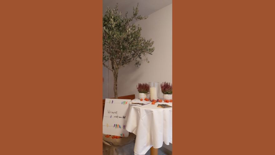 Wir haben die Besucher*innen eingeladen darüber nachzudenken, „welche Farbe ihre Trauer“ heute hat. Die ausgewählte Farbe konnte als Erinnerung auch mit nach Hause genommen werden.