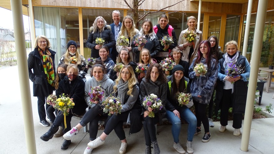 Schüler*innen der Tiroler Fachberufsschule für Garten, Raum und Mode in Hall übergaben uns am Donnerstag, den 17. Oktober 2022, Blumensträuße für unser Hospizhaus.