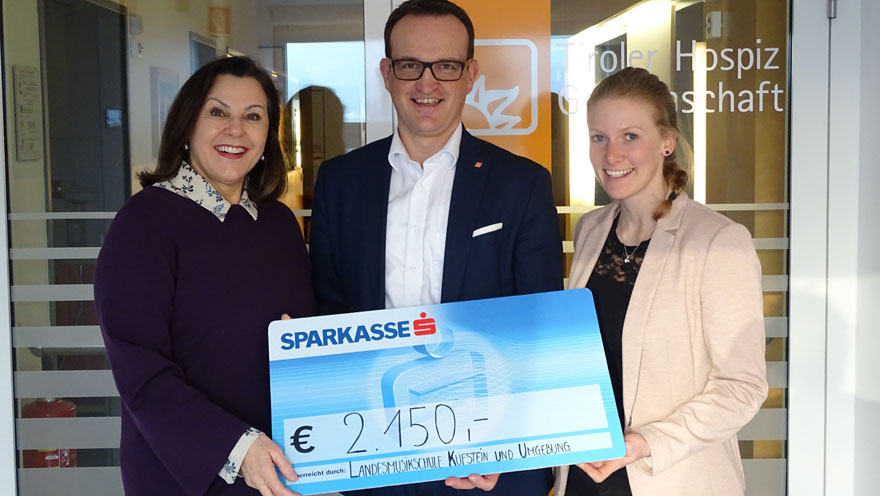 Die Einnahmen in Höhe von 2.150 € wurden an die Tiroler Hospiz Gemeinschaft gespendet. Frau Dr. Elisabeth Zanon, Vorstandsvorsitzende der Tiroler Hospiz Gemeinschaft, nahm die Spenden im Beisein von Herrn Günther Klausner, Direktor der Landesmusikschule Kufstein und Umgebung, und Frau Theresa Spielmann, als Vertretung der Studierenden-Projektgruppe, am Montag, 19. Februar 2018 entgegen und bedankte sich herzlich.