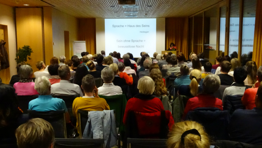 An diesem Abend verdeutlichte Müller den Anwesenden die Wirkung von Worten. Sie bekräftigte die Macht der Sprache und appellierte in ihren Ausführungen an eine neue gewaltfreie Sprache, die geprägt ist von Sprachgenauigkeit und sich einer sanften Sprache bedient, in dem Bewusstsein, dass Sprachhandlungen Handlungen sind. Denn in dem wir uns auf Seiten der behandelnden Berufsgruppen unserer Handlungen klarer werden, die vielen Ausdrucksmöglichkeiten innerhalb der Sprache nutzen und sie behutsam einsetzen, kann uns Sprache als heilendes, förderndes und unterstützendes Vehikel dienen.