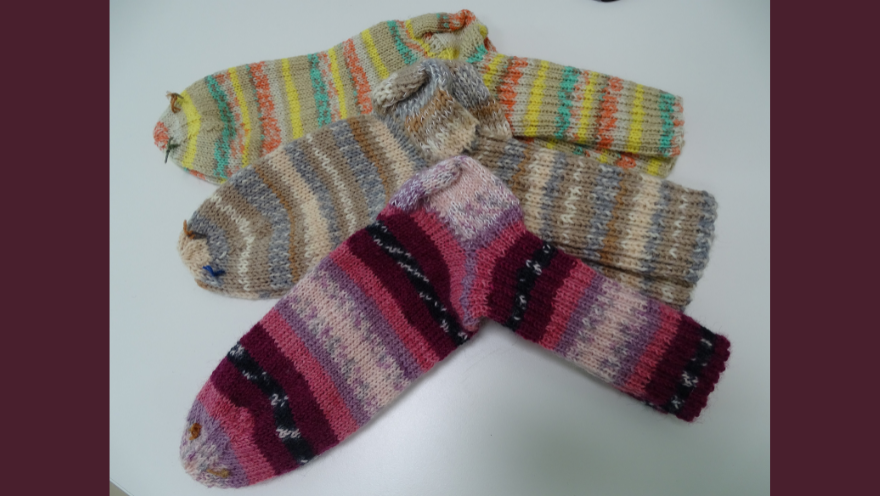 Die Patientin, Frau Maria freut sich, dass sie für ihre kalten Füße wollig weiche, warme Socken bekommen hat. Sie sagt: „So schöne, bunte Farben. Da hätte ich früher nicht den Mut gehabt, so bunte Socken anzuziehen. Jetzt liebe ich bunte Farben. Die Socken sind so fein, auf der Haut.“