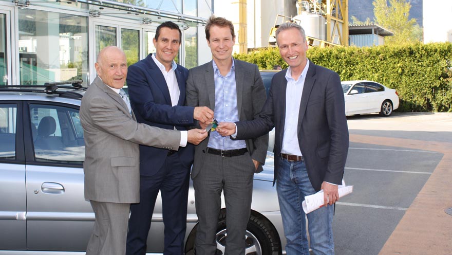 Dr. Helmut Fröhlich (links) und Mag. Werner Mühlböck (rechts) dankten bei der Schlüsselübergabe Mag. Dieter Unterberger (2.v.r.) und Gerald Unterberger (2.v.l) für das neue Auto. Die Unterberger Gruppe stellt der Tiroler Hospiz-Gemeinschaft das Fahrzeug kostenlos zur Verfügung. Das Auto schenkt uns die nötige Mobilität, damit wir schwerkranke Menschen und ihre Angehörigen schnell und umfassend betreuen können.