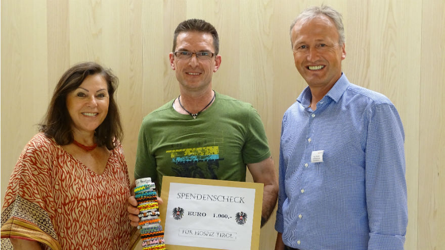 Elisabeth Zanon (Vorsitzende der Tiroler Hospiz-Gmeinschaft), Christian Nerat und Werner Mühlböck (Geschäftsführer Tiroler Hospiz-Gemeinschaft) freuen sich über die großzügige Unterstützung zugunsten des ehrenamtlichen Kinder-Hospizteams.