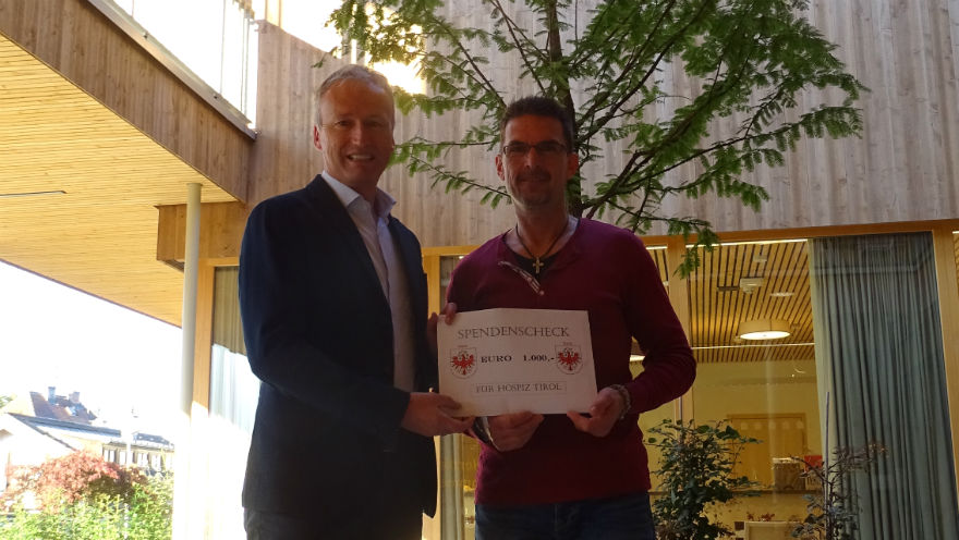 Werner Mühlböck (Geschäftsführer Tiroler Hospiz-Gemeinschaft) und Christian Nerat freuen sich über die großzügige Unterstützung zugunsten des ehrenamtlichen Kinder-Hospizteams. Bereits zum zweiten Mal in diesem Jahr übergab Christian Nerat der Tiroler Hospiz-Gemeinschaft eine Spende in der Höhe von 1.000 Euro. Vielen Dank!