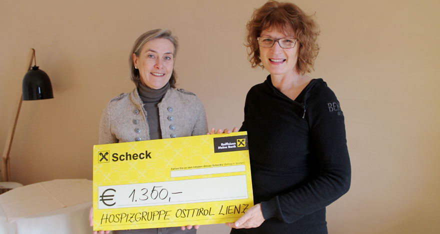 Regina Mayr (Seelsorgestelle Herz Jesu Kirche Peggetz) und Reinhilde Tabering (Regionalbeauftragte für Osttirol) freuen sich gemeinsam mit dem Pfarrteam über die großzügige Unterstützung der Hospizarbeit in Osttirol. Im Rahmen der Heiligen Messe am 20. November 2016 mit anschießendem gemütlichen Beisammensein in der Landwirtschaftlichen Lehranstalt in Lienz sammelte das Pfarrteam 1.350 Euro für die ehrenamtlichen Hospizgruppen im Bezirk. Vielen Dank für die diese wo wichtige Hilfe!