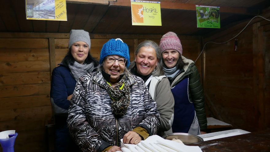Am 9. Dezember bot die Hospizgruppe Inzing im Rahmen des Inzinger Adventmarkts kulinarische Köstlichkeiten an: Glühwein, Apfel-Ingwerpunsch und den Fruchtikuss (=Malven-Orangentee mit Honig gesüßt). Zum Essen gab es Blattln entweder mit gedünstetem Kraut oder mit Preiselbeeren.