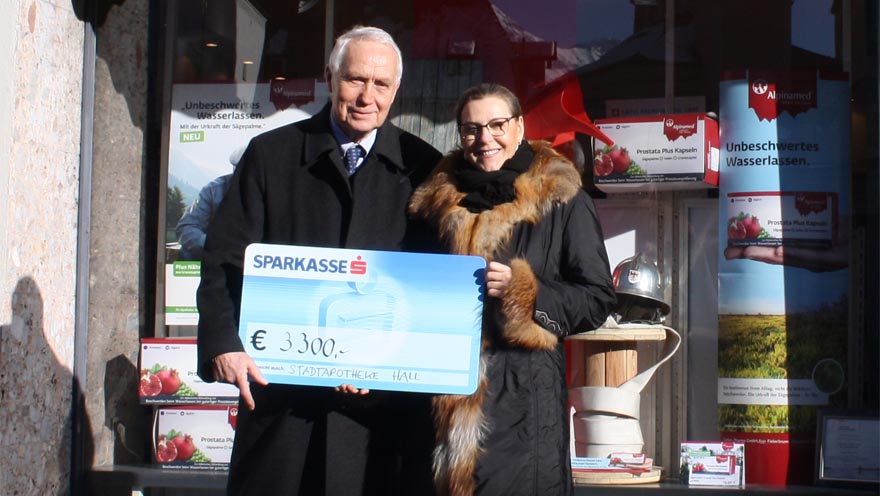 Mag. pharm. Günther Pollack und Dr. Elisabeth Zanon freuen sich über die großzügige Spende der Kur- und Stadtapotheke Hall in Tirol.