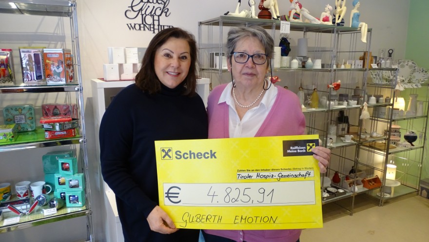 Wir danken Marie-Louise Guberth für ihre großzügige und anhaltende Unterstützung der Hospizbewegung in Tirol. Marie-Louise Guberth sammelt seit viereinhalb Jahren in Ihrem Geschäft Spenden für die Tiroler Hospiz-Gemeinschaft.