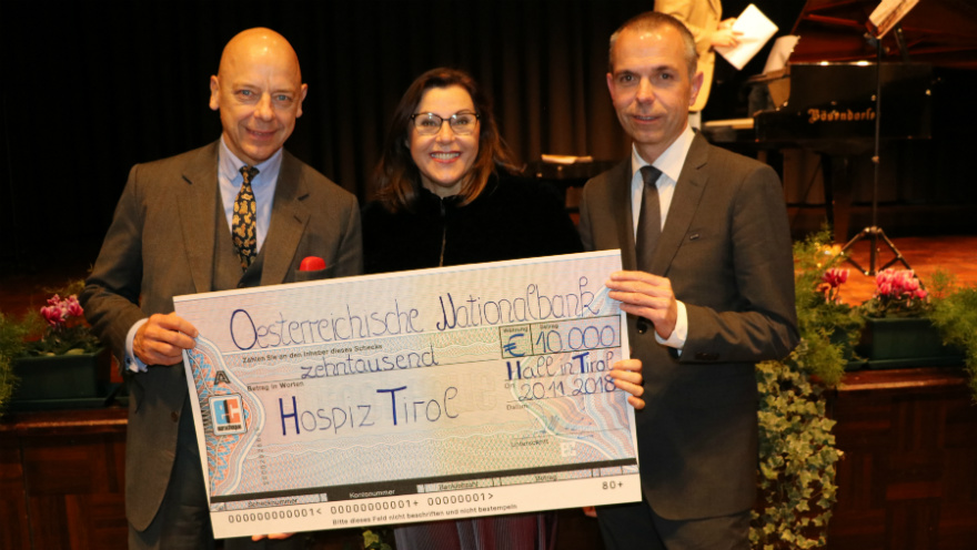 Dr. Kurt Pribil (Direktoren der Österreichischen Nationalbank), Dr. Elisabeth Zanon (Vorsitzende Tiroler Hospiz-Gemeinschaft) und Mag. Armin Schneider (Leiter Österreichische Nationalbank West) freuen sich über die großzügige Unterstützung für das Hospizhaus Tirol.