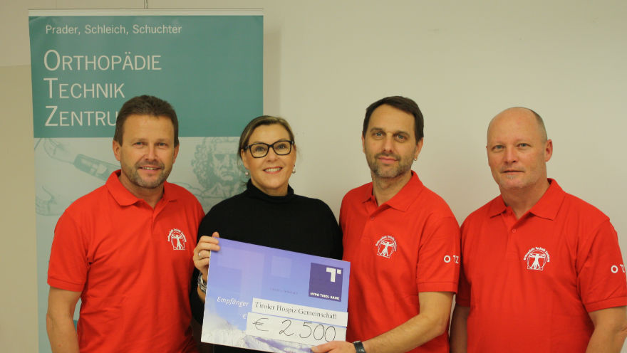 Das Orthopädie Technik Zentrum in Innsbruck widmet seine diesjährige Weihnachtsspende der Tiroler Hospiz-Gemeinschaft. Bei der Scheckübergabe bedankte sich Dr. Elisabeth Zanon (Vorsitzende der Tiroler Hospiz-Gemeinschaft) für die großzügige Unterstützung in der Höhe von 2.500 Euro.