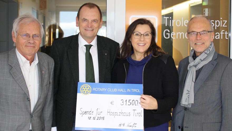 Josef Thurner, Präsident Hansjörg Kraft, Dr. Elisabeth Zanon und Christoph Neuner freuen sich über die großzügige Spende für das Hospizhaus Tirol. Der Rotary Club Hall in Tirol sammelte 31.500 Euro für das geplante Hospizhaus und trägt dadurch wesentlich zur Finanzierung dieses wichtigen Vorhabens bei. Vielen Dank für diese so wichtige Hilfe!