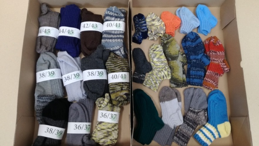 Roswitha Gruber hat die Socken ursprünglich für einen Adventsbasar gestrickt, der aufgrund der Corona-Maßnahmen 2020 nicht stattgefunden hat. Ein paar der Socken konnte sie im letzten Jahr „für einen guten Zweck“ verkaufen, und sie hat den Erlös bereits der THG gespendet.